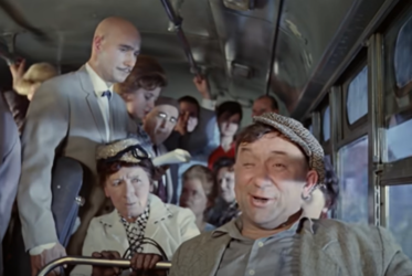 Shurik, ever gallant, pretends to be blind, and Fedya, defeated, finally gets up. That’s when Shurik whips off the dark glasses he’s been wearing, and offers the now-vacant seat to the pregnant woman.