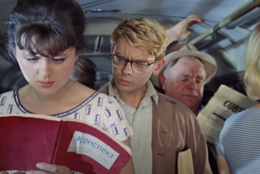 Well-written notes are in big demand, and one day, as he’s going on the bus, Shurik happens to notice that the girl (Natalya Seleznyova) sitting next to him is studying from a book that seems to have very well-written notes. Shurik and the girl get so utterly absorbed in reading the notes that they don’t even realize whom they’re sharing the book with. The girl, Lida, absent-mindedly still thinks she’s with the girl friend whom she’d got onto the bus with; Shurik can’t even be bothered to wonder over whom he’s with, as long as the book is there, in front of him.