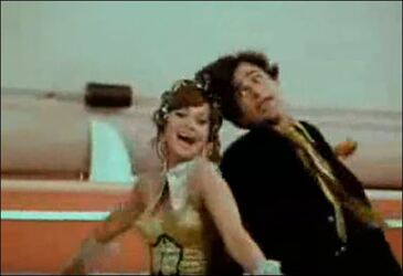 The song, as it appears in the film, is very short: a rehearsal is in progress, and we get to see Helen and Shashi Kapoor only briefly together as they dance atop a giant red typewriter, on the keys of which dance a troupe of extras—and each key (very smart, this) depresses as a girl jumps on to it, then springs back up when she moves on. I love the set of this, and would have loved to see this as a full-fledged song instead of only the snippet one sees in the film. If you want to listen to the entire song (which was recorded), click here.