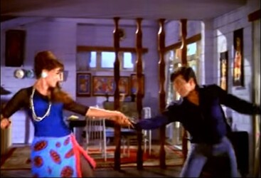 6. Nineteen fifty-six (Anari, 1959): With Raj Kapoor. Raj Kapoor doesn’t seem to me to have the brilliant flair for dance that his brothers Shammi and Shashi Kapoor did, though he wasn’t completely graceless, as can be seen on the odd occasion when he’s shown waltzing. Here, in this song from Anari, however, since he’s playing a naïve and unfashionable man who never stepped on a dance floor in his life, it’s logical that he should stand about and make odd movements that he hopes qualify as dance. Helen and he don’t really do much dancing together—she is the pretty lead dancer of a troupe, and while she’s in the limelight, even going up and then coming down atop a glittery chandelier-like apparatus, he’s left to do most of his dancing with the troupe itself. A good song, nevertheless.