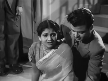 Rani’s dearest friend is the shy, retiring Kanmani (Anjali Devi), a motherless girl whose father, Ramanathan Pillai (?) is in a flap because he is not being able to get Kanmani married. Not through any fault of hers; it’s because his had been an intercaste marriage, Kanmani’s mother of a lower caste than his. The many fruitless attempts to find a match for Kanmani have left her father and Kanmani herself in despair. If only Sundaram were here, they moan: Sundaram being a cousin of Kanmani’s to whom her mother had promised Kanmani in marriage.