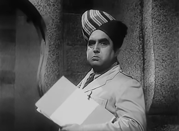 Kundan tries to find work, but his reputation has spread and nobody will give him work. When, tired and hungry, he tries to seek shelter, he is turned away wherever he goes. Eventually, however, a bit of advice from a kind passerby leads him to the doorstep of a saintly monk (Murad). This monk doesn’t just let Kundan in; he welcomes Kundan, he makes sure Kundan is fed on a silver platter, with silver diya-stands lit in front of him. When a ravenous Kundan, having stuffed himself, asks that he be allowed to sleep in the cowshed, the monk refuses and takes him to a comfortable room.
