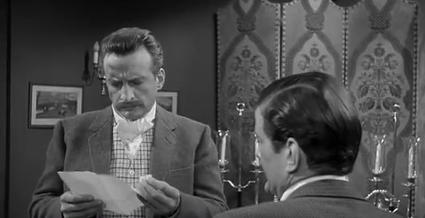 Right now she has company: her cousin Adrian Messenger (John Merivale), who is a writer and heir to Gleneyre, is here, as is their friend Anthony Gethryn. When Adrian and Anthony are alone, Adrian asks his friend for a favour…