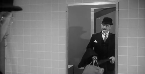 … while the man, having deposited that heavy bag, goes to the men’s and having locked himself in, starts to undergo a transformation. A wig and a mask come off; he is revealed as Kirk Douglas.