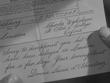 Meanwhile (yes, again). A telegram arrives for Charley from Dona Lucia, letting Charley know that she has other pressing matters to attend to and so will not be coming.