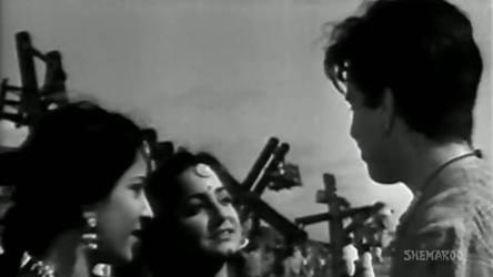 The one reason you should—I won’t say ‘watch’, but perhaps check out, as in ‘fast-forward from one song to the next’—Mela is for Naushad’s wonderful music. He was already a hit composer before this film came along, and he gave it several very good songs, sung mostly by Mukesh and Shamshad Begum, though the famous Yeh zindagi ke mele is by Mohammad Rafi. Among the great songs here are Gaaye jaa geet milan ke tu apni lagan ke, Dharti ko aakaash pukaare aaja aaja, Aayi saawan rut aayi, and Main bhanwra tu hai phool.