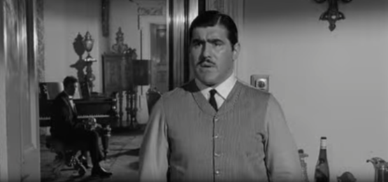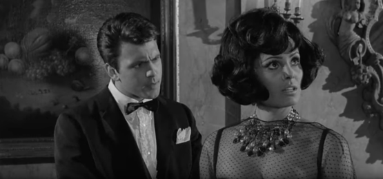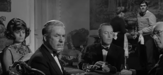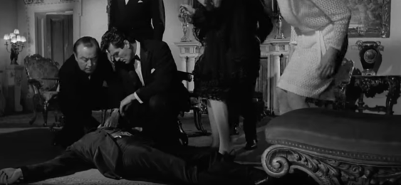 The Grohmanns show the guests to their rooms. None of these guests have ever met each other, though from the curious looks some of them bestow on the others, it’s obvious they’re at least interested. The American Hugh Lombard (Hugh O’Brian) and the host’s newly-appointed secretary, Ann Clyde (Shirley Eaton) seem, for instance, to like what they see.