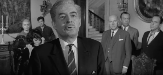 … when suddenly a voice (Christopher Lee’s, though he’s not credited) booms out of nowhere, addressing the eight guests, as well as the Grohmanns. This unseen man introduces himself as their host, Mr UN Owen, and tells them why he’s invited them to congregate here, in this out-of-the-way old mansion: to receive their punishment for murders they’ve committed.