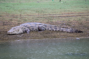 Then, as we got deeper into the reserve forest, we began to see mammals and other, bigger, species along the shores. Lots of spotted deer (chital), of course; but also a sambar deer family; a wild dog (Nagarhole has a large number of these); and a species we, at least, had never seen before: the crocodile or mugger. We saw one of these sunning itself on the Kerala side bank of the Kabini, and two others, further along on our safari.