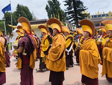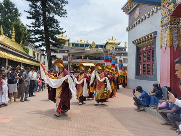 Our visit to Namdroling turned out to be a thing of pure serendipity. Here we were, not having planned this at all; and when we walked through the gate, we discovered that there was some major event in progress. A vast shamiana had been spread out across the square just inside the gate. Under this, forming a square ring, sat hundreds of visitors, nearly all Tibetans, probably lay people.