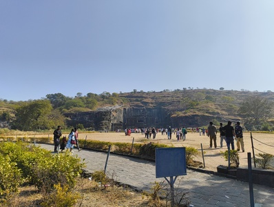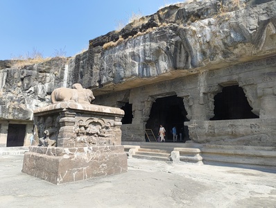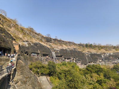 The Ellora Caves were carved out of rock between the 8th and the 10th centuries CE, during the rule of the Rashtrakuta kings. They are a melange of Hindu, Buddhist and Jain temples, with the most famous and most impressive one, the Kailasa Temple, being situated pretty much right opposite the entrance/ticket counter. Kailasa Temple is in Cave #16, and on either side of it stretch other caves, connected by a path, wide and with a good surface. For those who have mobility issues, wheelchairs are available; but since one needs to climb steps to reach pretty much all of the caves, this isn’t all that useful.