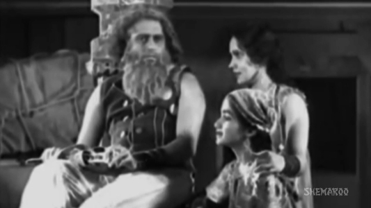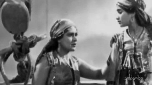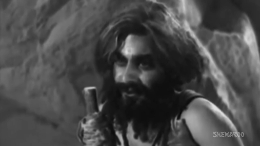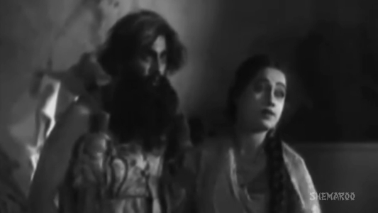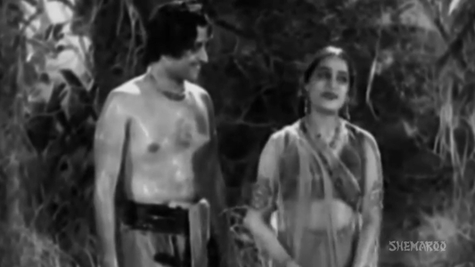 He is therefore eager to please. When Nandini complains of boredom, he allows her to step out, through an aperture in the cave wall, into the jungle beyond. Nandini goes out and there, in the sylvan surrounds of the forest, happens to make the acquaintance of a shepherd named Sudhir (B Nandrekar).