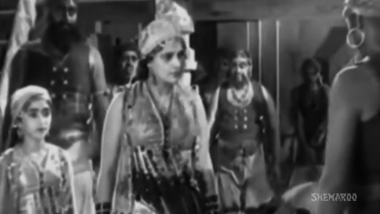 But I am getting ahead of myself. Let me circle back to the beginning of this film. On the high seas, Saudamini commands her pirate vessel, with a large band of pirates at her beck and call. Two people here are special to Saudamini: one is a man named Shekhar (K Narayan Kale); the other is Shekhar’s daughter (I think; it’s not very clear), Rekha (Vasanti). Saudamini is obviously grooming Rekha to be a pirate queen like her, and the precocious child is just as obviously eager to take on the mantle.
