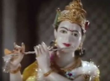 I am not a Krishnabhakt (I’m not even a Hindu), but when you’re a diehard fan of old Hindi cinema, you can’t really avoid noting the many, many references to Krishna, can you? The fact is, Krishna is one Hindu deity who seems to appear in just about every other old Hindi film featuring a Hindu household. Mostly, he’s in the form that little painted/gilded idol, draped dhoti, peacock feather, and flute in his hands, that stands in the little household shrine, seen in passing. Often, when some tragedy hits (or threatens) someone (invariably female) comes and weeps before the idol. Or sings, pleading for mercy, for succor.